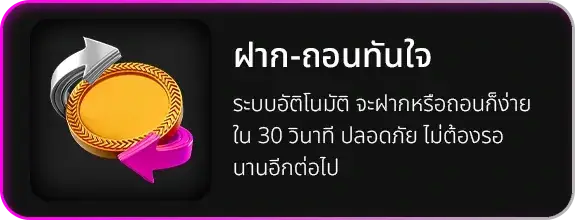 ตอบ : ออกแบบมาเพื่อรองรับผู้เล่นทุกระดับด้วยระบบอัตโนมัติที่ไม่มีขั้นต่ำในการฝาก รองรับทั้งการโอนผ่านธนาคารในประเทศและระบบ E-Wallet ทำให้การทำรายการเสร็จสิ้นภายในเวลาไม่เกิน 30 วินาที เพิ่มความคล่องตัวในการวางเดิมพัน